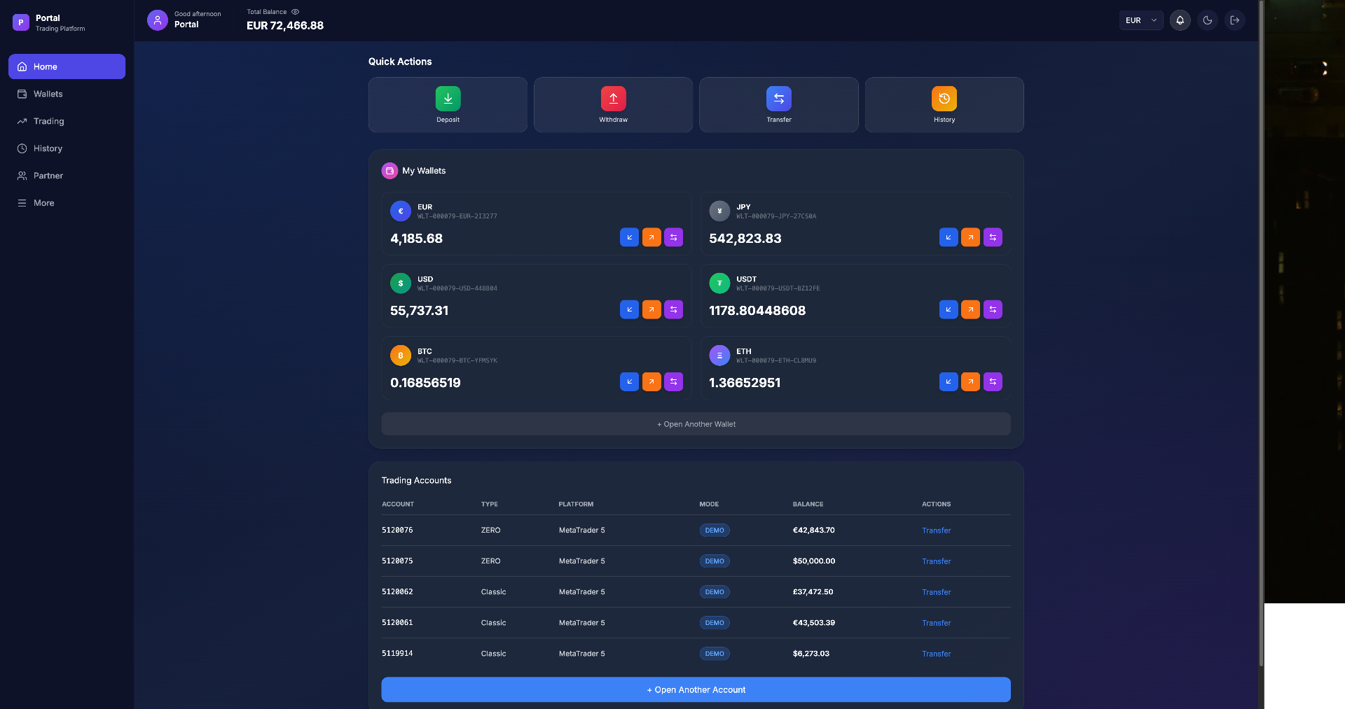 Quick actions, multi-currency wallets, and trading accounts at a glance