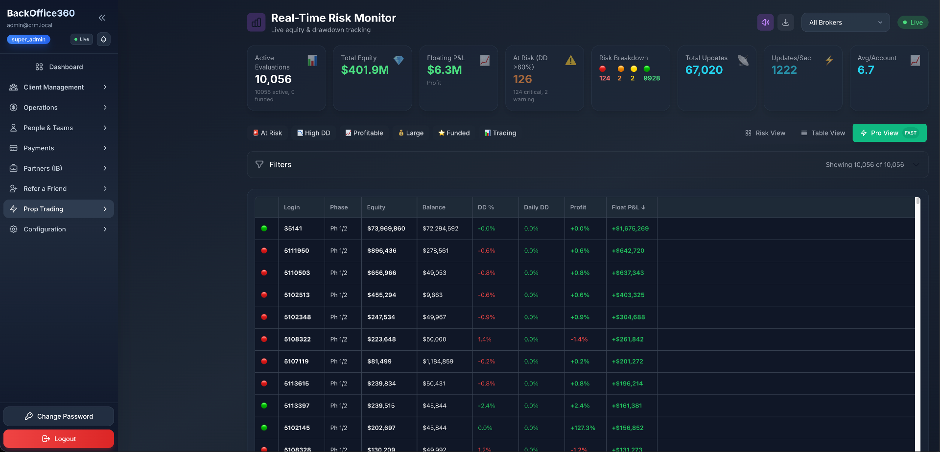 Monitor 10,000+ accounts live with real-time equity tracking, drawdown alerts, and comprehensive risk metrics.